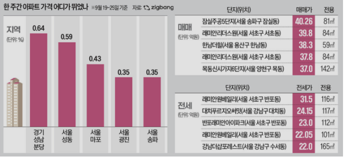 지난주(9월 19~25일) 전국 아파트값 상승률 1위는 경기 성남시 분당구로, 단 1주일 만에 0.64% 급등했습니다.