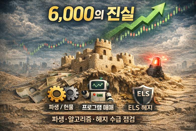 코스피가 6,000을 넘어 6,300까지 치솟는 동안, 현물보다 파생·프로그램·ELS 헤지 수급이 가격을 움직였다는 해석이 힘을 얻고 있습니다. 누가, 왜, 어떻게 샀는가를 냉정하게 정리합니다.